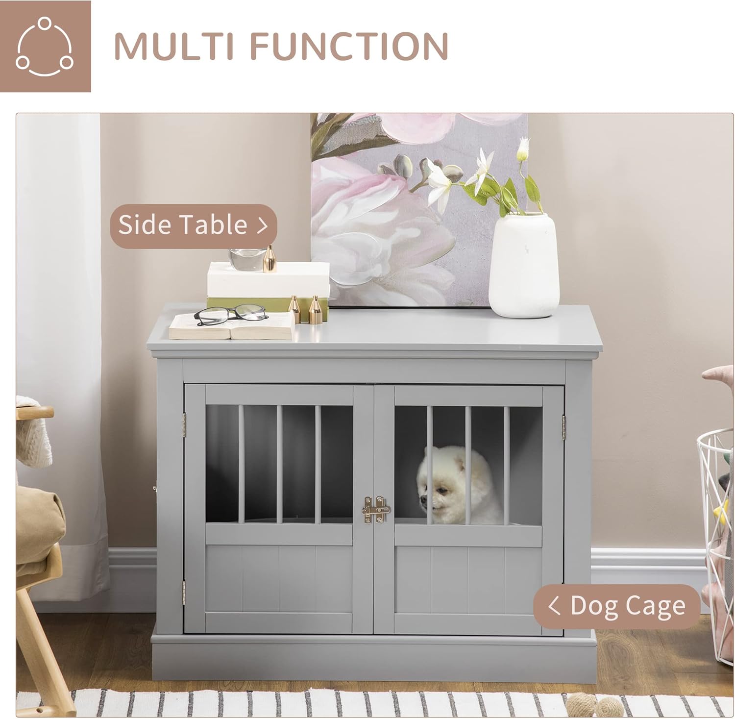 Featuring three doors, including a fully opening long side for easy access, the magnetic closures ensure effortless and secure latching. Gray Furniture Kennel is durable and ideal for small dogs to 22 lbs, bringing refined furniture and convenience to your living space.