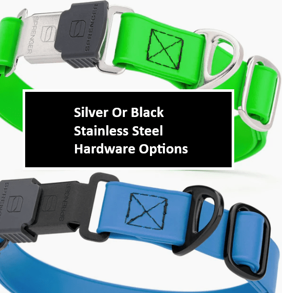 This premium collar is a combination of authentic biothane webbing, heavy duty waxed thread stitching, stainless steel welded D-ring with quick release buckle.